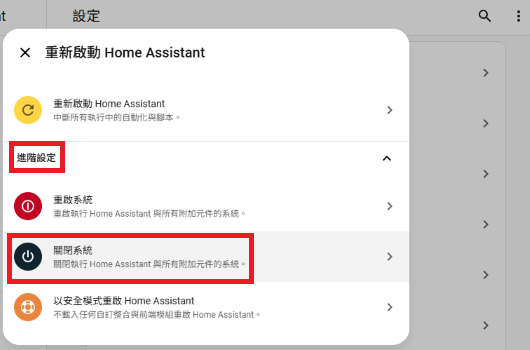 先選「設定」,關機藏在右上角3個點,選「重新啟動 Home Assistant」後,要再按下「進階設定」,才會跳出「關閉系統」的選項。