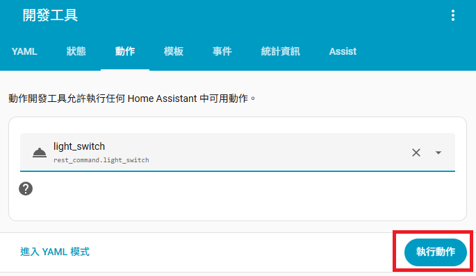 至「開發工具」重新載入 YAML 設定後,就可以在「動作」搜尋到建立好的 light_switch,可按下「執行動作」確認服務正常。