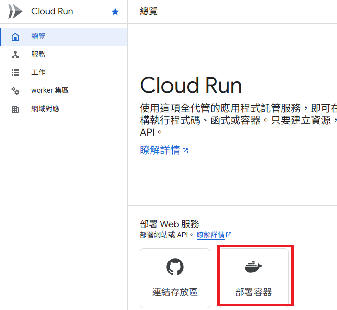 進入 GCP 頁面 > 至「Cloud Run」選擇「部署容器」