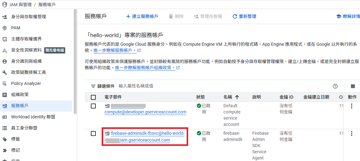 先在 Firebase 建立好專案,再到 GCP 控制台中,前往「IAM 與管理」>「服務帳戶」,找到「firebase-adminsdk」開頭的帳號。