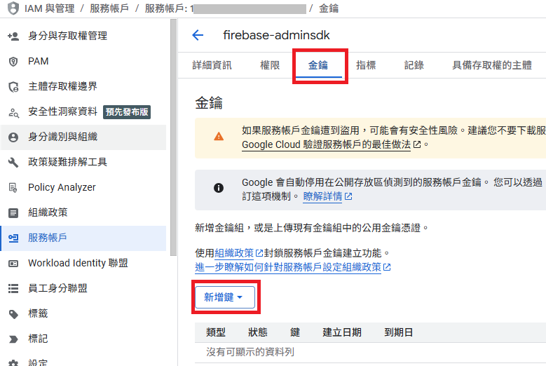 進入並建立金鑰,會取得 JSON 檔案。複製一份到專案資料夾底下,並命名為 firebase-adminsdk.json