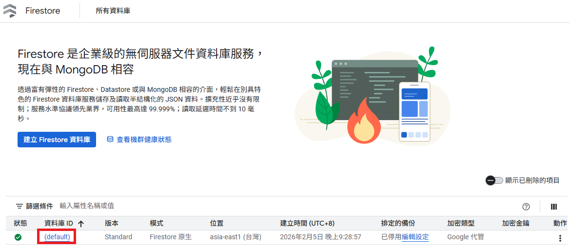 從 GCP 控制台找到 Firestore,並進入資料庫